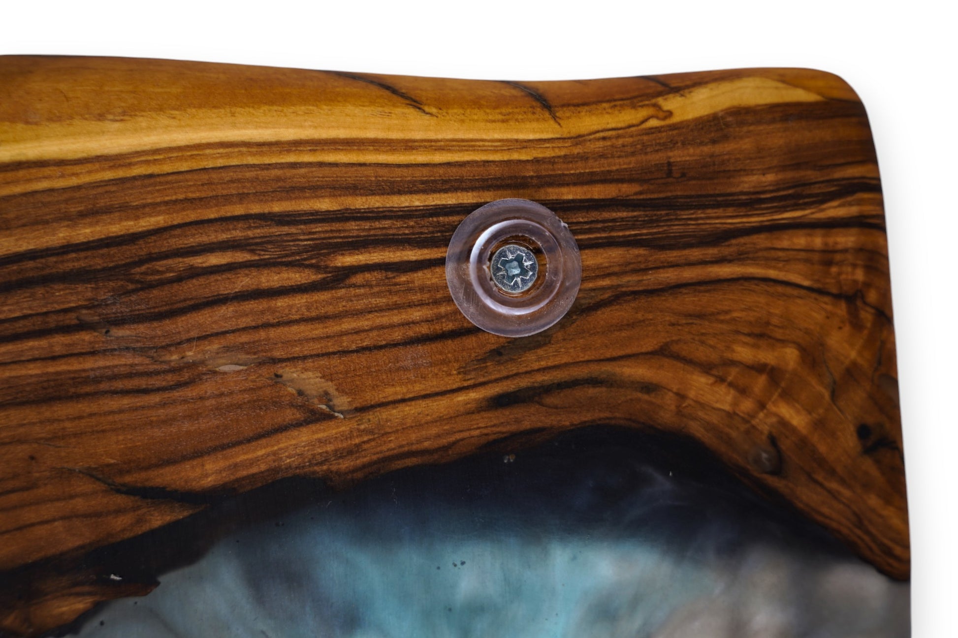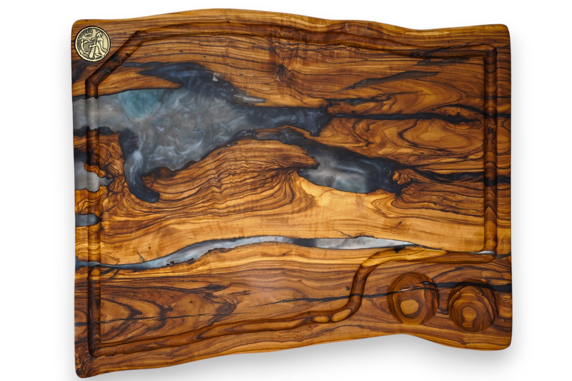 Our butcher block is made from ancient Israeli olive wood, hundreds and even over a thousand years old, combined with high-end crystal epoxy that reveals the natural grain, depth, and textures etched into the wood over generations.