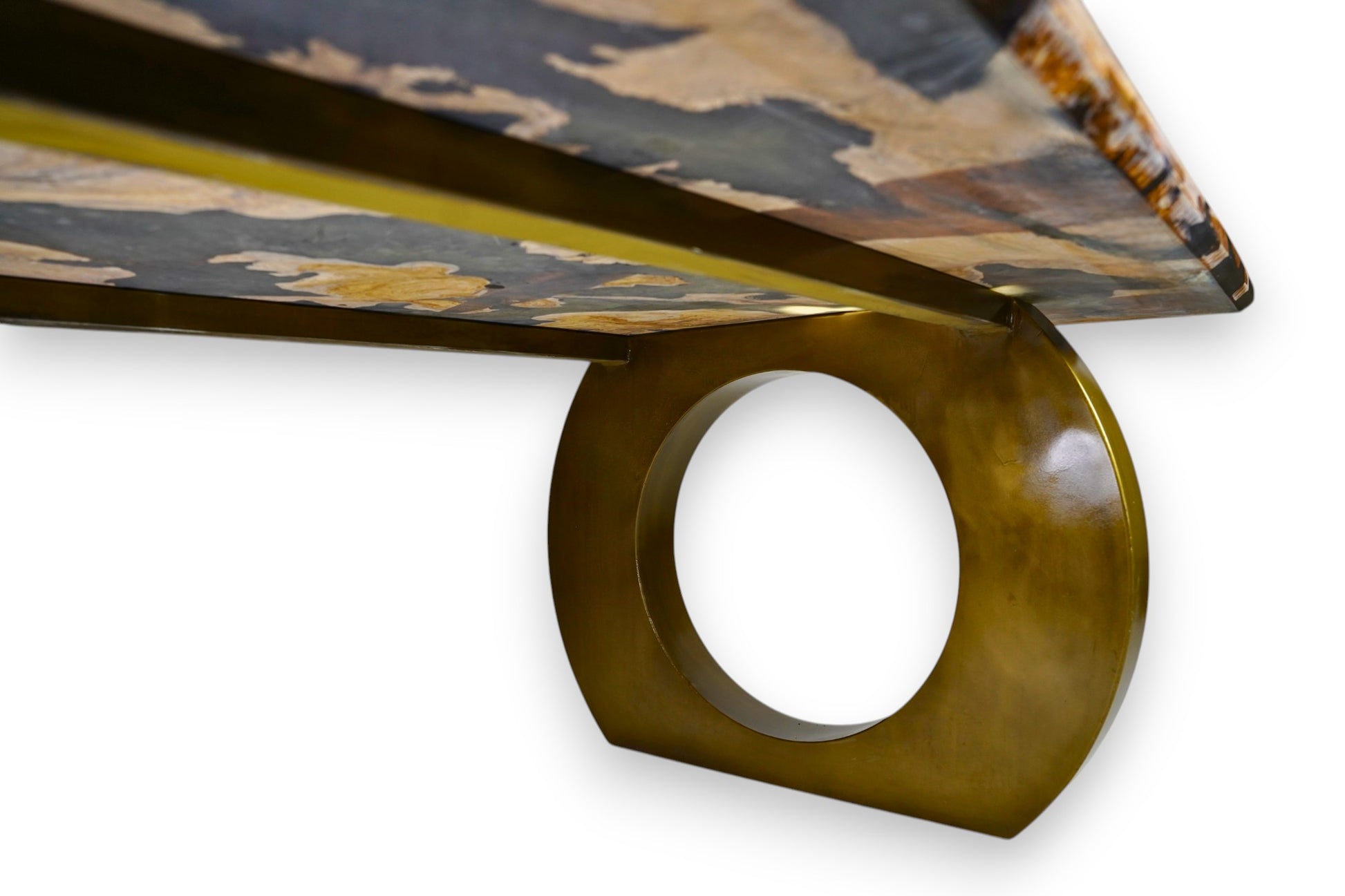 The sculptural base, cast in antique-golden metal, balances modern elegance with timeless strength. Its circular form conveys stability, harmony, and an artistic presence, elevating the table into a true statement piece.